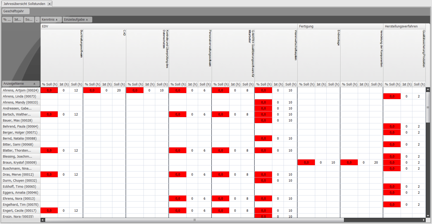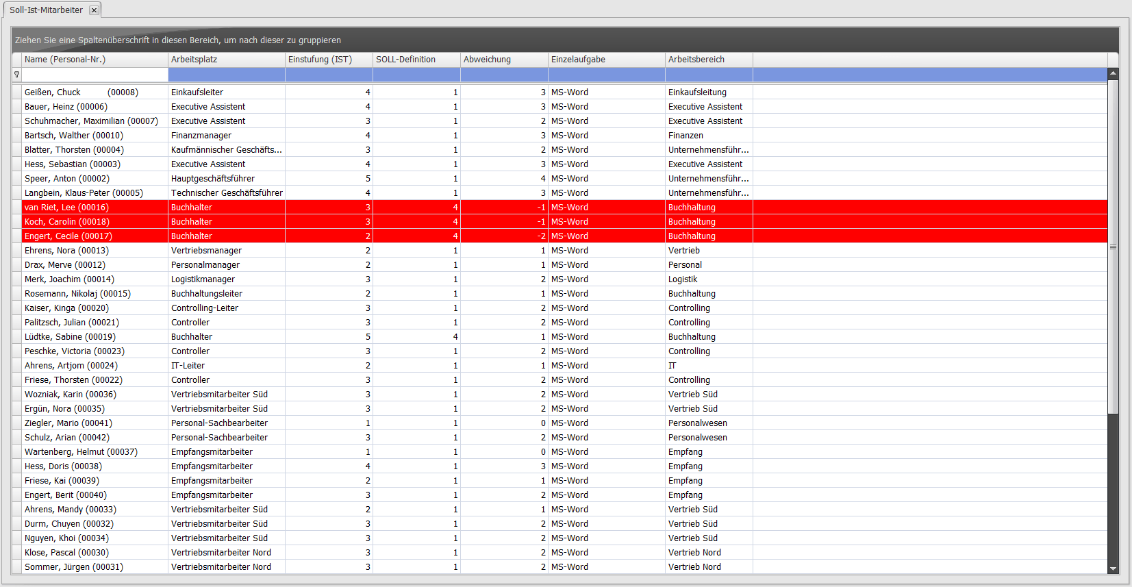 Sie können sofort erkennen (rot) bei welchem Mitarbeiter ein möglicher Bildungsbedarf besteht. Die Zahlen für SOLL und IST ermitteln sich dabei aus der Summe aller Einzelaufgaben an diesem Arbeitsplatz.
