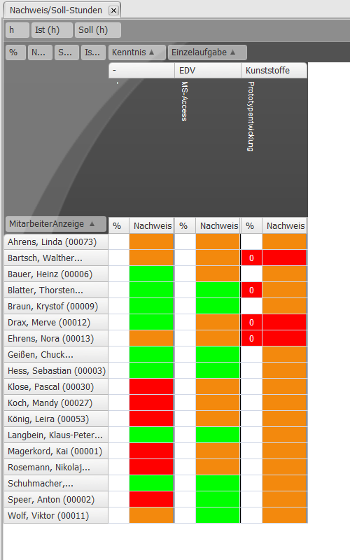 In der Auswertungstabelle Mitarbeiter - Einzelaufgaben lesen Sie den jeweils aktuellen Qualifizierungsgrad jedes Mitarbeiters ab.