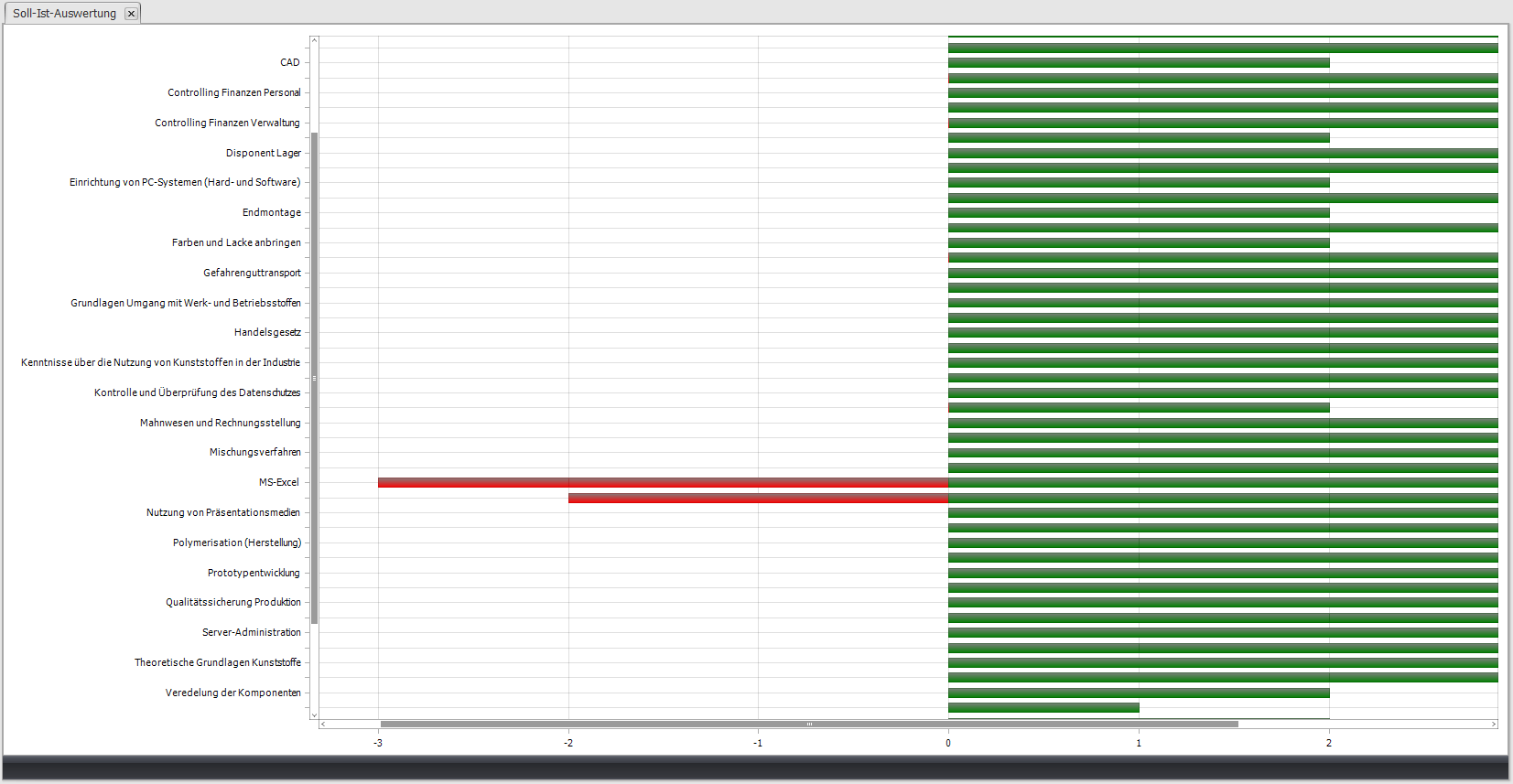 Bei jeder Einzelaufgabe symbolisieren ein roter oder ein grüner Balken, wie weit einzelne Qualifikationseinstufungen der Mitarbeiter von den in Ihrem Unternehmen definierten Soll-Anforderungen (0-Punkt) der Einzelaufgabe abweichen. Während der rote Balken eine negative Abweichung, also im weitesten Sinne Qualifizierungsbedarf bedeutet, steht der grüne für die (Über)Erfüllung der Soll-Anforderungen.