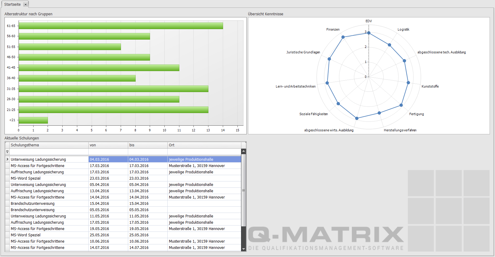 Auch dem demografischen Wandel in unserer Gesellschaft und in den Unternehmen der Wirtschaft wird in Q-Matrix Rechnung getragen. Behalten Sie die Altersstrukturen in Ihrem Unternehmen oder auch in jeder Abteilung im Überblick. So können Sie frühzeitig und gezielt einer Überalterung entgegen wirken und Arbeitsplatzbesetzungen langfristig planen. Eventuell ist es dabei sinnvoll, einzelne Mitarbeiter speziell für die entsprechenden Arbeitsplätze zu qualifizieren. Mit den Demografie-Tools von Q-Matrix haben Sie eine sinnvolle Unterstützung Ihrer Unternehmens- und Personalentwicklung in Händen.