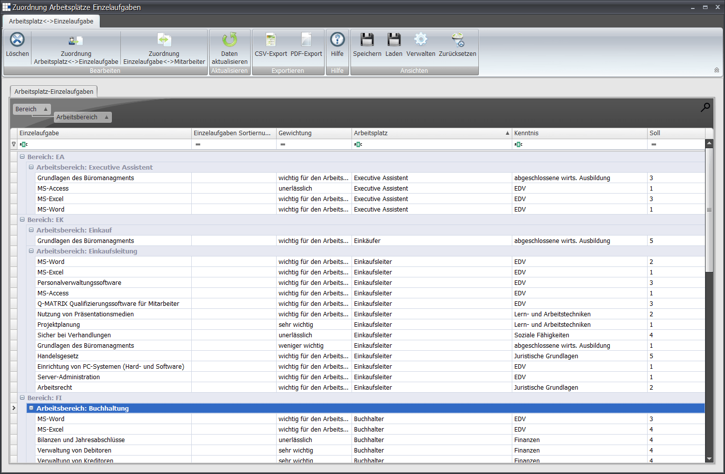 Die Antwort liegt in unseren umfangreichen Skill-Management-Tools in der Q-Matrix. Verschaffen Sie sich durch individuelle Sortier- und Filtermöglichkeiten den Überblick, welche Mitarbeiter über Ihre Einzelaufgaben am Arbeitsplatz hinaus, über Fähigkeiten und Zusatzkenntnisse verfügen, die Sie gezielt auch für Ihren unternehmerischen Erfolg einsetzen können.