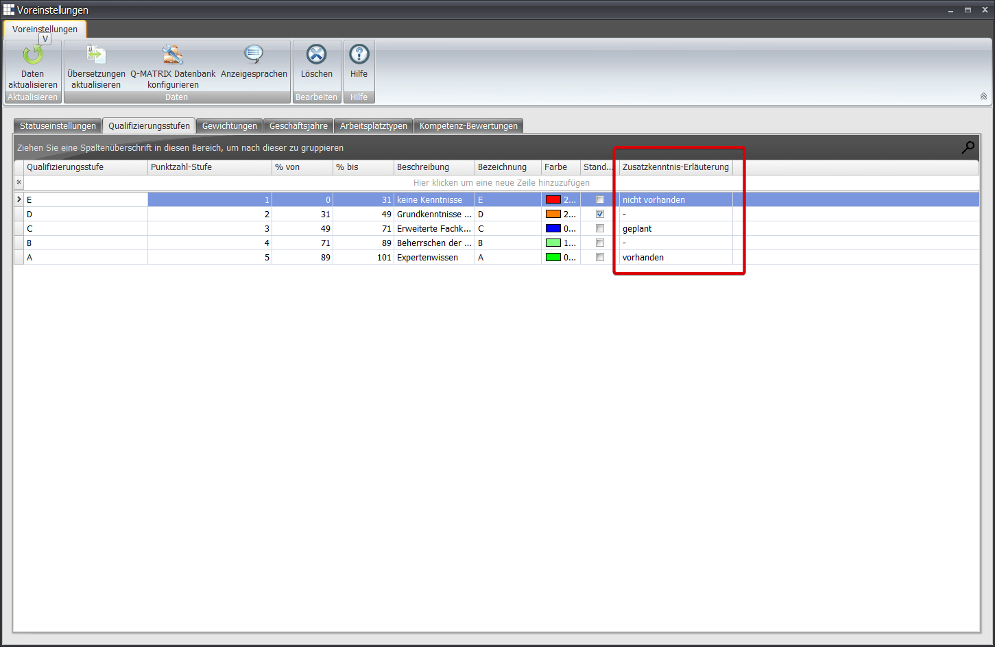 Definieren Sie zunächst Zusatzkenntnistypen (z.B. Führerscheine, Sprachen, EDV-Wissen ...) und ordnen Sie diesen die passenden Zusatzkenntnisse in einer übersichtlichen Liste einfach zu. Definieren Sie anschließend die Bewertungskriterien für die Zusatzkenntnisse mit einer individuellen Skalierung.