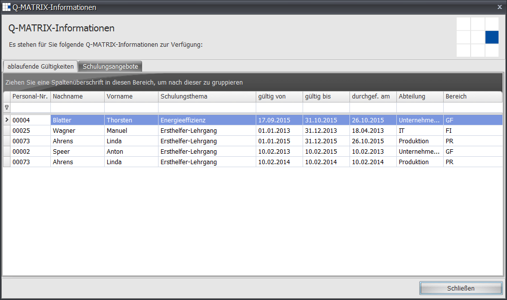 Alle Schulungen, die ein Gültigkeitsdatum haben, welches kleiner als das heutige Datum plus (+) 60 Tage ist, werden für die jeweiligen Mitarbeiter aufgelistet. Diese Liste wird benutzerrollenabhängig angezeigt, d.h. ein Anwender sieht immer nur die für seine Rolle relevanten Informationen. Beispielsweise sieht ein Mitarbeiter der Personalabteilung alle Informationen, wo hingegen ein Abteilungsleiter nur die Informationen für seine Abteilung zu sehen bekommt.
