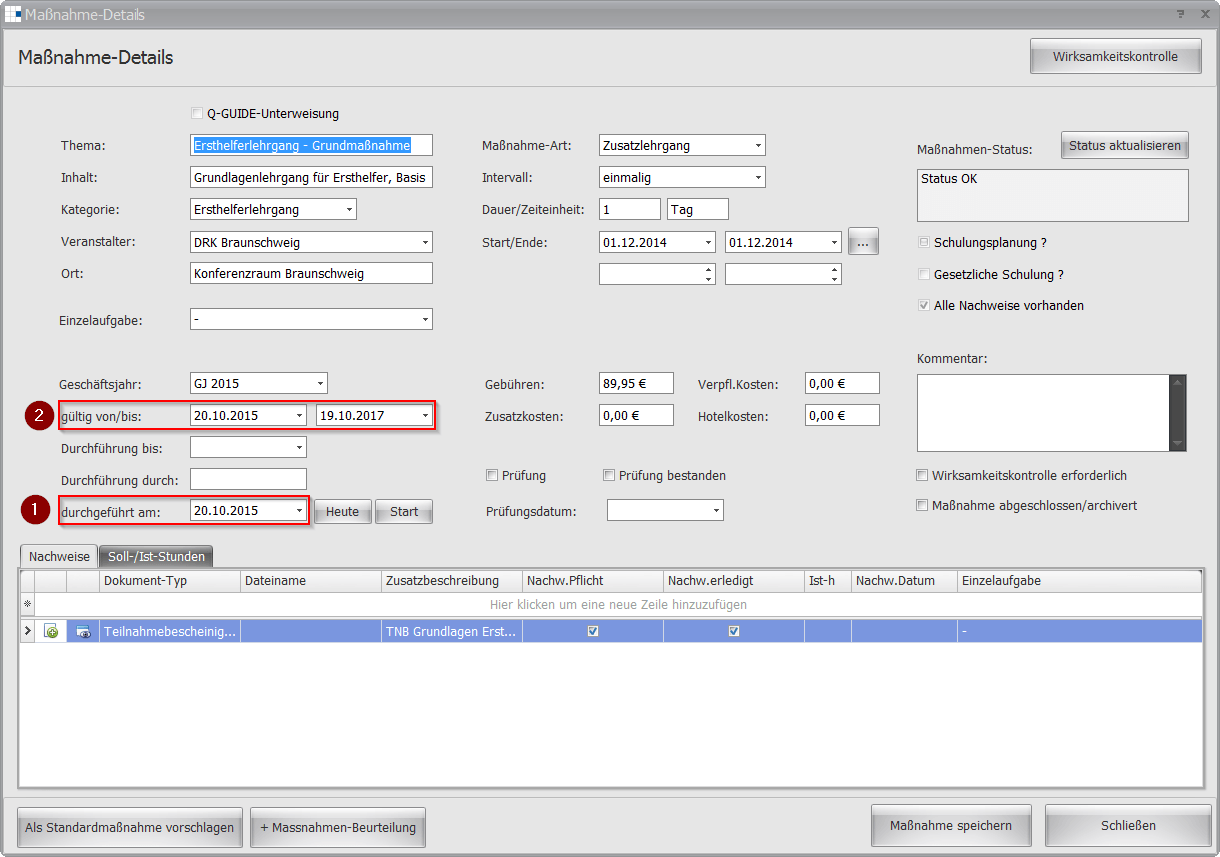Die grundlegenden Einstellungen zu allen Schulungen und sonstigen Maßnahmen werden in der Regel von Personalverantwortlichen oder dem Administrator vorgenommen. Sie sind daraufhin im Maßnahmenkatalog automatisch vorbelegt. Unter anderem wird auf diesem Wege auch die Gültigkeit von gesetzlich vorgeschriebenen Schulungen hinterlegt. Diese Vorbelegungen werden automatisch aktualisiert und bei der Übernahme mit den gültigen Werten eingestellt.
